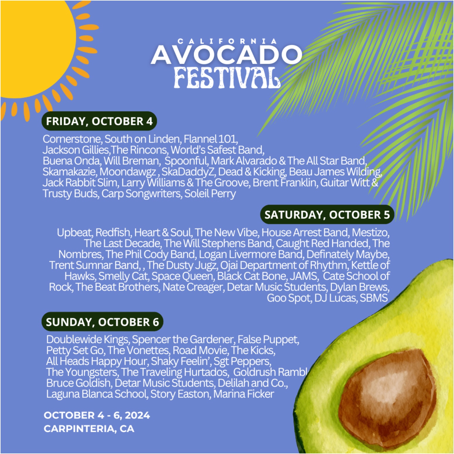 Carpinteria’s annual Avocado Festival is returning this weekend, October 4th through October 6th! The California Avocado Festival began in 1986 to benefit local fundraising efforts, non profit groups, and tourism. Santa Barbara county is the third largest avocado producer in North America, so the festival was named after the avocado to celebrate Carpinteria’s major contribution to the industry. The festival has since evolved into one of the largest in California, with three days of delicious food, great music, and family friendly fun!