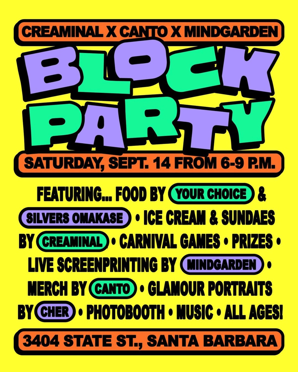 This Saturday is the Creaminal x Canto x Mindgarden block party! Delicious Thai and Japanese food will be served by Your Choice and Silver Omakase with sweet ice cream from the Creaminal. Shop for cool clothing at Canto or grab some merch from Mindgarden who’ll be doing live screen printing. Also enjoy glamour portraits by Cher, photo booths, carnival games, prizes and great music.