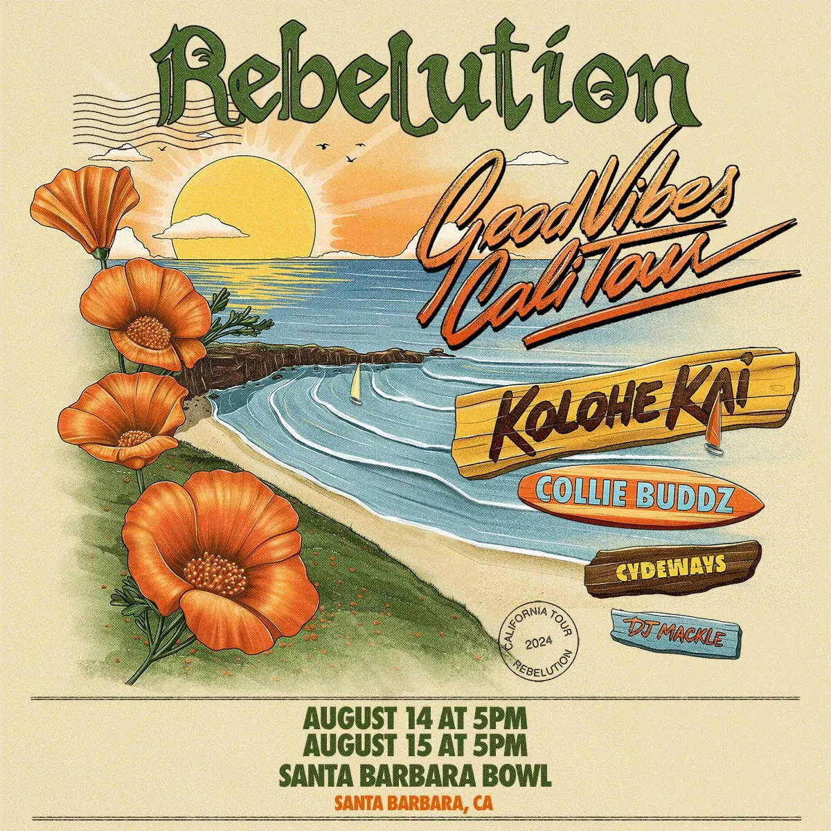 Rebelution, known for their upbeat music and strong sense of community, returns to the Santa Barbara Bowl on August 14 & 15 with their Good Vibes Cali Tour 2024! Featuring special guests Kolohe Kai, Collie Buddz, Cydeways and DJ Mackle.
